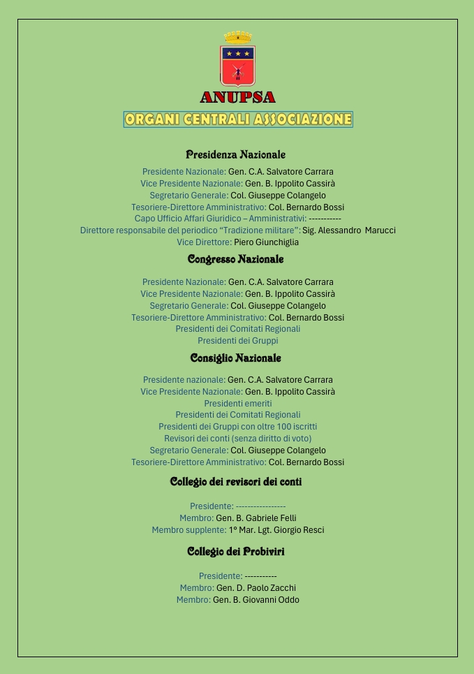 ANUPSA - Associazione Nazionale Ufficiali Provenienti dal Servizio Attivo, è una associazione no profit che collabora con il personale in servizio e le istituzioni militari e civili, custodendo le tradizioni e valori della nostra patria e delle forze Armate.